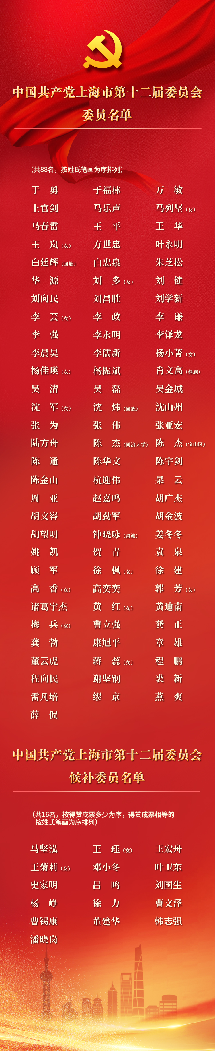 中共上海市第十二届委员会委员名单、候补委员名单